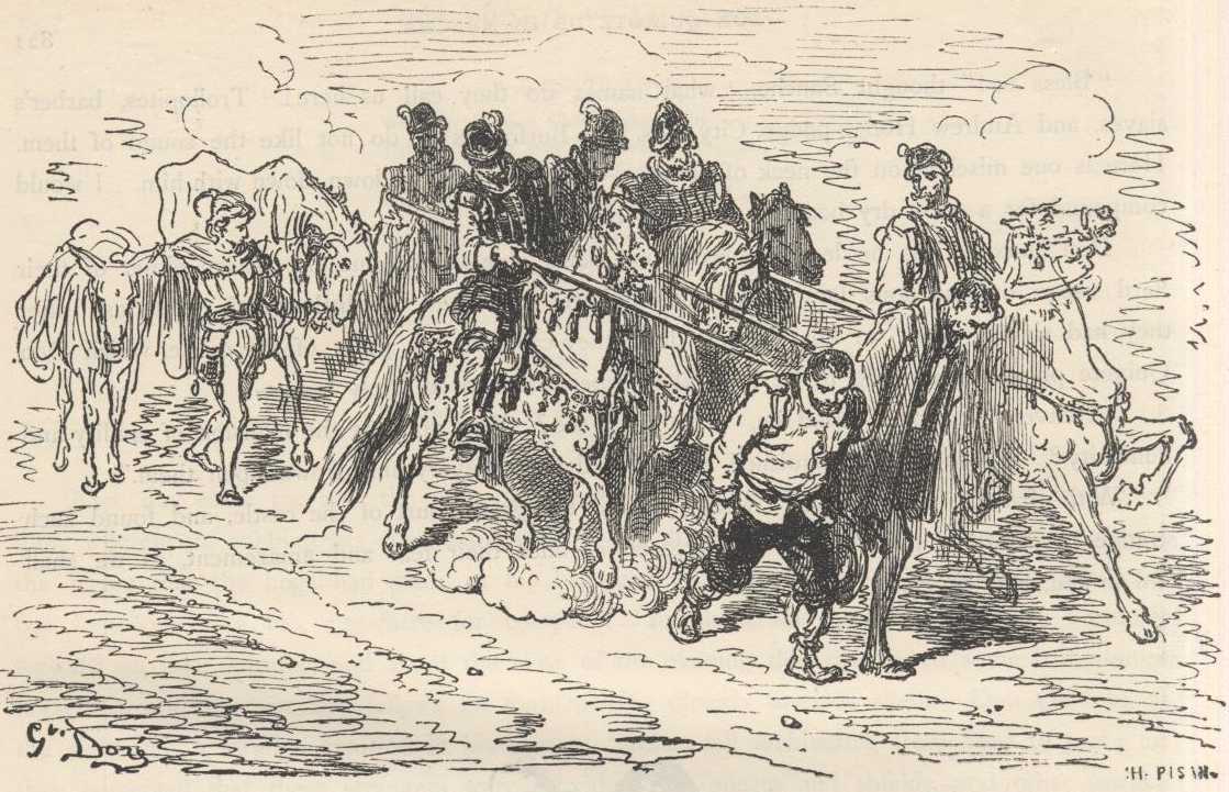 And now daylight came, and the sun smote Sancho on the eyes with his beams. He awoke, roused himself up, shook himself and stretched his lazy limbs, and seeing the havoc the pigs had made with his stores he cursed the drove, and more besides. Then the pair resumed their journey, and as evening closed in they saw coming towards them some ten men on horseback and four or five on foot. Don Quixote's heart beat quick and Sancho's quailed with fear, for the persons approaching them carried lances and bucklers, and were in very warlike guise. Don Quixote turned to Sancho and said, "If I could make use of my weapons, and my promise had not tied my hands, I would count this host that comes against us but cakes and fancy bread; but perhaps it may prove something different from what we apprehend." The men on horseback now came up, and raising their lances surrounded Don Quixote in silence, and pointed them at his back and breast, menacing him with death. One of those on foot, putting his finger to his lips as a sign to him to be silent, seized Rocinante's bridle and drew him out of the road, and the others driving Sancho and Dapple before them, and all maintaining a strange silence, followed in the steps of the one who led Don Quixote. The latter two or three times attempted to ask where they were taking him to and what they wanted, but the instant he began to open his lips they threatened to close them with the points of their lances; and Sancho fared the same way, for the moment he seemed about to speak one of those on foot punched him with a goad, and Dapple likewise, as if he too wanted to talk. Night set in, they quickened their pace, and the fears of the two prisoners grew greater, especially as they heard themselves assailed with—"Get on, ye Troglodytes;" "Silence, ye barbarians;" "March, ye cannibals;" "No murmuring, ye Scythians;" "Don't open your eyes, ye murderous Polyphemes, ye blood-thirsty lions," and suchlike names with which their captors harassed the ears of the wretched master and man. Sancho went along saying to himself, "We, tortolites, barbers, animals! I don't like those names at all; 'it's in a bad wind our corn is being winnowed;' 'misfortune comes upon us all at once like sticks on a dog,' and God grant it may be no worse than them that this unlucky adventure has in store for us."