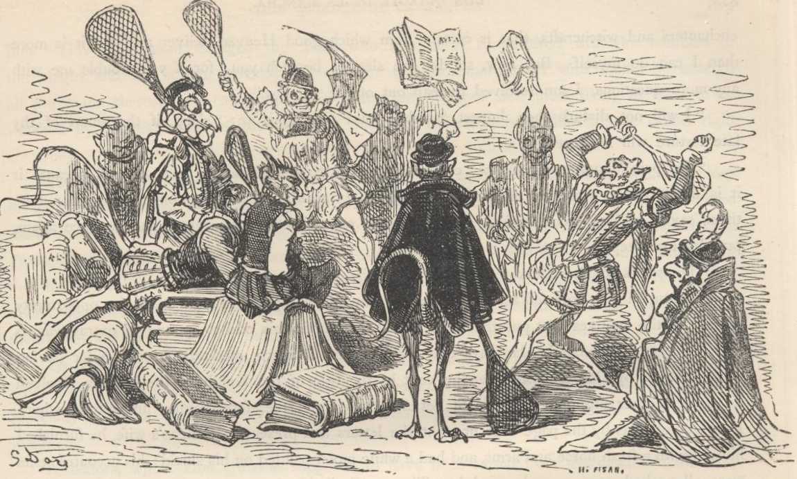 The book cover and spine above and the images which follow were not part of the original Ormsby translation—they are taken from the 1880 edition of J. W. Clark, illustrated by Gustave Dore. Clark in his edition states that, "The English text of 'Don Quixote' adopted in this edition is that of Jarvis, with occasional corrections from Motteaux." See in the introduction below John Ormsby's critique of both the Jarvis and Motteaux translations. It has been elected in the present Project Gutenberg edition to attach the famous engravings of Gustave Dore to the Ormsby translation instead of the Jarvis/Motteaux. The detail of many of the Dore engravings can be fully appreciated only by utilizing the "Enlarge" button to expand them to their original dimensions. Ormsby in his Preface has criticized the fanciful nature of Dore's illustrations; others feel these woodcuts and steel engravings well match Quixote's dreams. D.W.