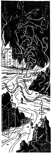 For a few minutes the giant Vegans watched the creatures wander about. One of them approached one of Pud's tails. Irritatedly Pud lifted it out of the way. The little creature snooped on, unaware that twenty tons of invisible silicoid flesh hung over its head. Pud curled the tail close to him, and did likewise with all his other tails.