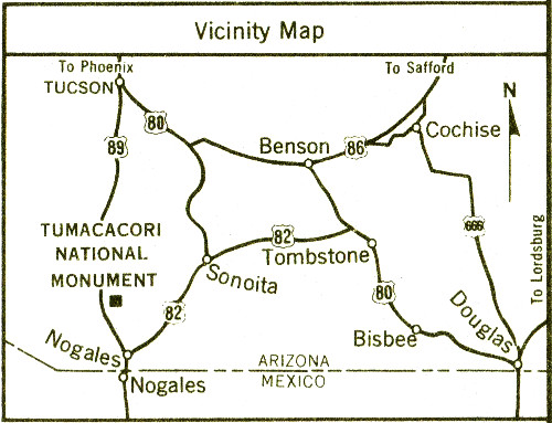 The monument, 48 miles south of Tucson and 18 miles north of Nogales on U.S. 89, is accessible by paved road throughout the year. Buses plying between these cities pass several times daily. The nearest rail connections and commercial airport are in Tucson.