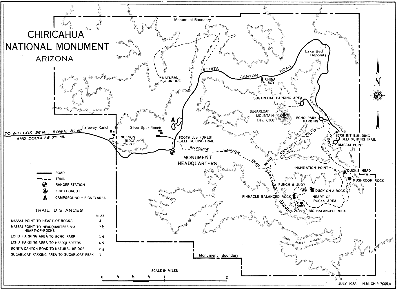 Chiricahua National Monument, established by Presidential proclamation on April 18, 1924, has an area of nearly 17 square miles. Elevations within the monument range from 5,160 to 7,365 feet above sea level. The monument entrance, which is on the west, is reached by roads from Bowie and Willcox, or by paved roads from Douglas and Bisbee.