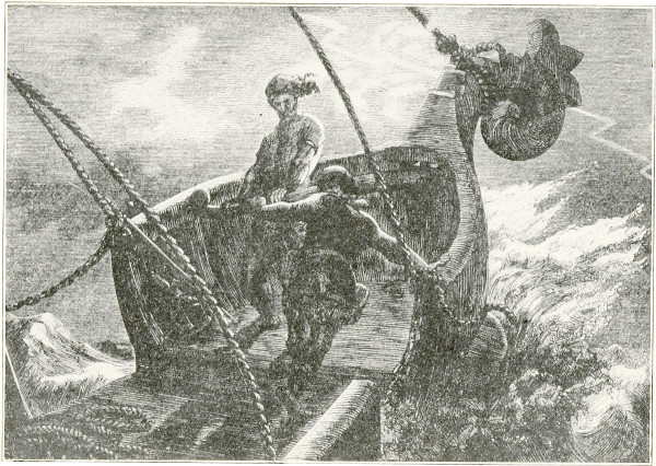 “This was the greatest misfortune which had ever befallen the gods in Valhalla. For a space they stood horror-stricken, gazing at the corpse of the gentle god. Then the vaulted halls echoed to their cries of woe. Beyond all words was their grief and anguish. At length they bethought them to seek the author of the evil deed; but vengeance was beyond their power, for Odin’s palace is a sanctuary. Moreover, Loke had vanished. With sighs and lamentations they bore the beloved dead to the seashore, where, drawn up on rollers, stood Balder’s ship. On this his body was to be burned. But all the efforts of the gods were powerless to stir the mighty vessel from its place; whereupon they summoned the giantess Hyrrocken (Fire Whirlwind) to their aid. A rushing sound was heard as she came with streaming hair, riding a great wolf bridled with a serpent.