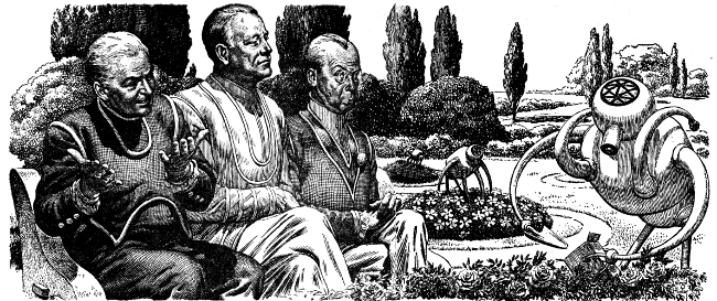 Consolator Steen smiled. "One of the Guardians, Joe. Superb—and completely incorruptible. Within minutes after we leave, every vestige of our visit will be gone—each piece of gravel we tread on will be scrubbed clean or replaced, each piece of grass we touch uprooted and destroyed, even the very air we breathe will be sterilized to remove our traces. We have our problem of vandals too, you know," Steen said, a wisp of a smile playing about the corners of his mouth. "But these are vandals who want to get in and leave something, not like those of ancient times on Earth who broke into burial grounds to loot and destroy. Yes, Joe, we found long ago that the only safe method was to employ mechanical devices to guard against clandestine burials. So even the gardeners who keep this Park in blossom are mechanical. See, there's another one over there, hard at work."