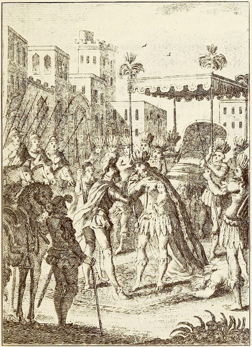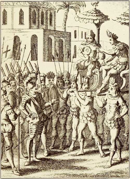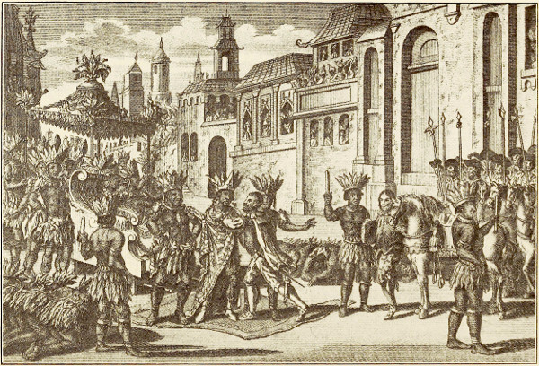 As they approached the house of the cacique, his Indian highness himself appeared. His figure revealed the nature of the infirmity which had prevented him from going out to meet his guests. He was so monstrously fat that he could scarcely walk, his servants having to support and move him along. His shapeless bulk and clumsy manner were so ludicrous that Cortes had some difficulty in restraining his men from loud laughter and in preserving his own seriousness. The attire of the cacique was gorgeous. He was dressed in a cloak profusely set with precious stones, and his ears and lips were perforated and richly adorned. His address of welcome did not in the least correspond with his laughable appearance. It was very clever, and well put together, and closed with the request that Cortes would condescend to be his guest and abide with him, so that they might have an opportunity to talk together at leisure. The rest of the day was spent in partaking of refreshment and enjoying the fruits which grew there in great profusion.