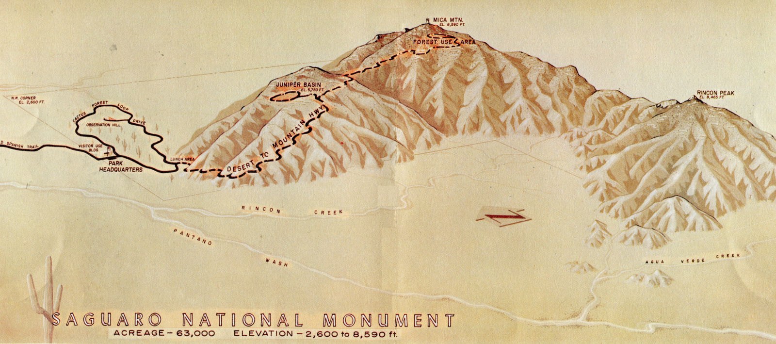 Saguaro National Monument is one of more than 175 units administered by the National Park Service, U. S. Department of the Interior. They include such outstanding scenic areas as Grand Canyon and Yosemite National Parks and other Parks and Monuments set aside for their scenic, scientific, historic or archeologic values. These superb areas are yours and are a part of your heritage as American citizens.
