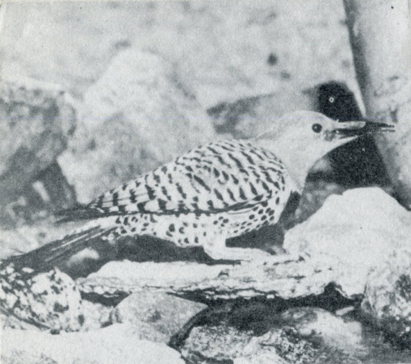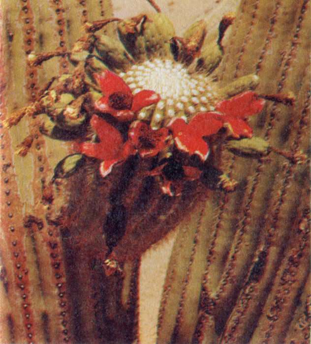 The ecological importance of the Saguaro to animals is better known. Two species of Woodpeckers, the Gila Woodpecker and the Gilded Flicker, drill deep holes into the plant and fashion nests in the cool interior. Actually this causes little damage to the Saguaro, which soon forms a thick scar tissue around the walls of the excavation, sealing it away from the rest of the plant. In succeeding years these nests may be taken over by Elf Owls, Sparrow Hawks, Flycatchers, or Purple Martins. Larger birds build their nests among the branches of the Saguaro. Chief among these are the Red Tail Hawks and Great Horned Owls.