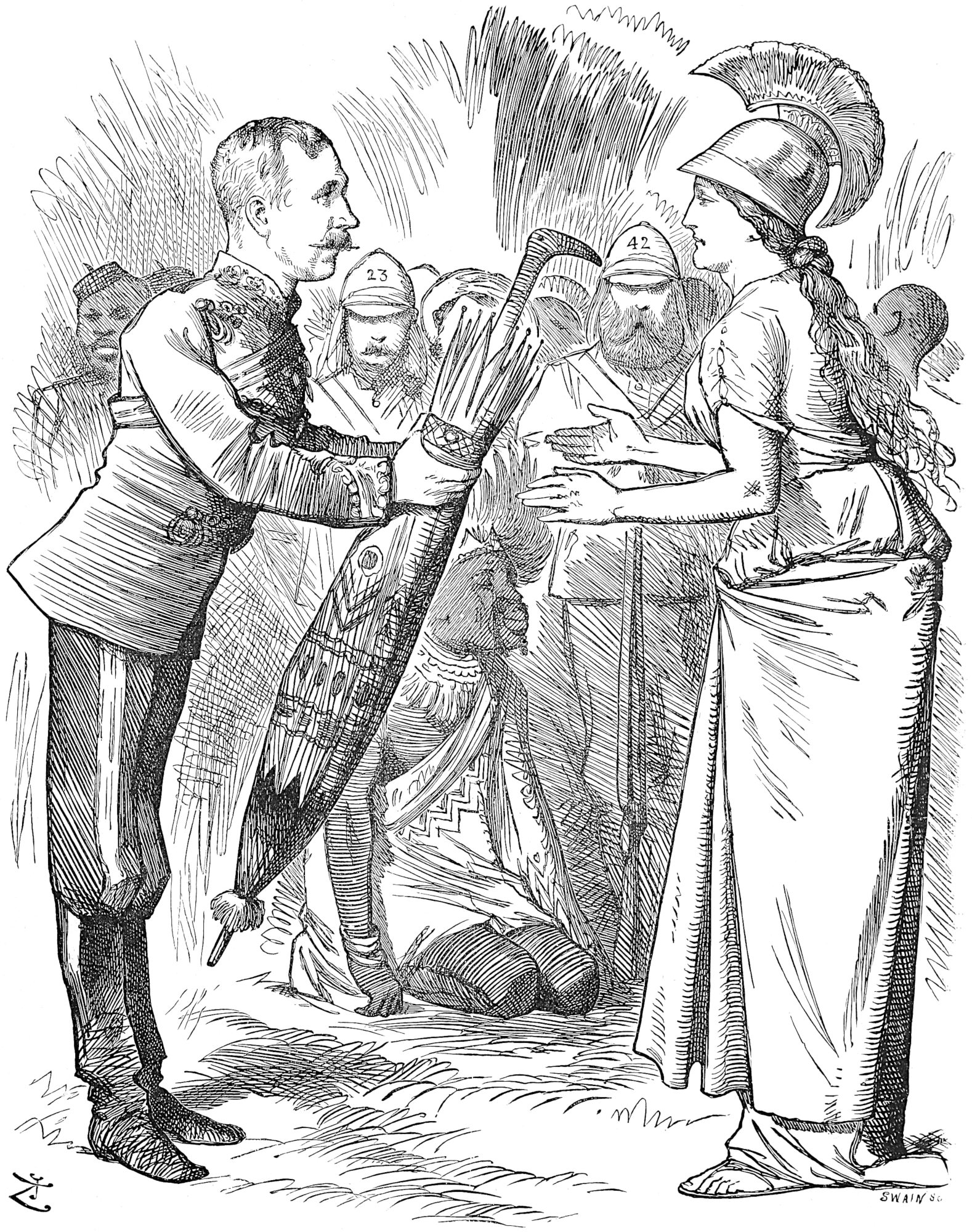 | Sir Garnet Wolseley’s march to Coomassie involved much loss of life, with little more result than the possession of the Umbrella, the symbol of Ashanti sovereignty. | |
