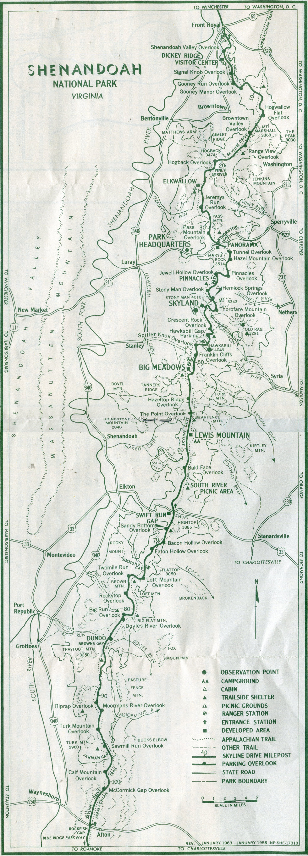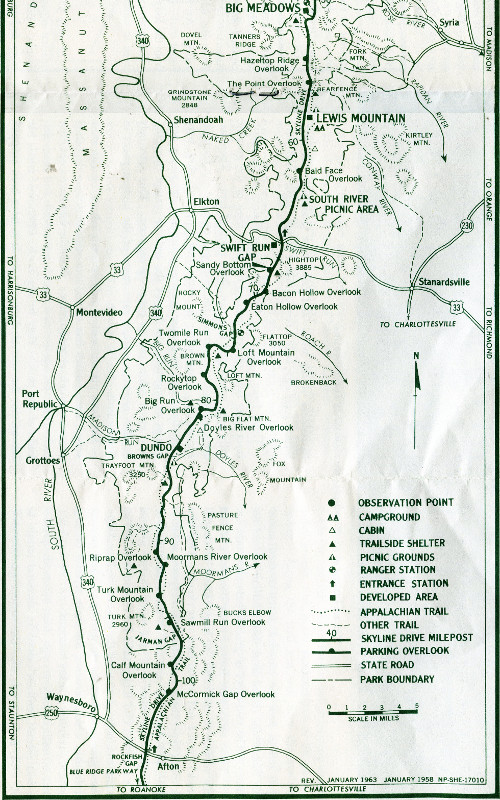 The drive is 105 miles long from Front Royal to Rockfish Gap. Mileposts numbered from north to south are keyed to the map on the left, and to the table below. Symbols indicate developed areas (accommodations, restaurants, service stations); entrance and ranger stations; camp and picnic grounds; trail cabins and shelters; roads and trails. Most picnic grounds have fireplaces; all have tables and water.