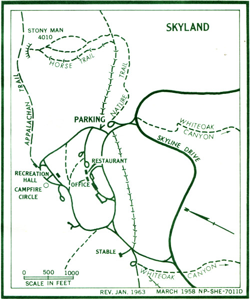 | 41.8 | Entrance to Skyland. Lodge rooms, cottages, dining room, coffeeshop, gift shop, riding horses. Accommodations for 350. May through Oct. Stony Man Nature Trail Parking Area | 3,680 |