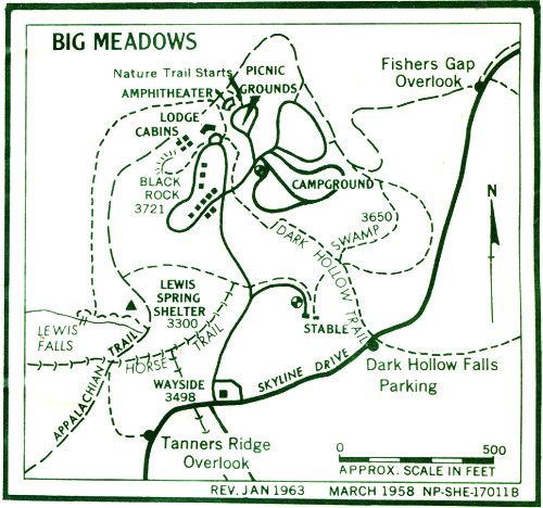 Of considerable interest is a swamp in one part of the fields, destination of the self-guiding trail fittingly called the Swamp Trail. Usually the pathway is quite dry, but in the damp areas nearby is an unusual variety of vegetation—gray birch, cardinal flower, and American burnet, all rare in the park. Remnants of the ghost forest of gaunt chestnut trees still stand. From the edge of the meadows there are fine views of the valley. An equally relaxing walk of another kind—along a forest trail—is to Dark Hollow Falls, a round trip of 3½ miles from the lodge.
