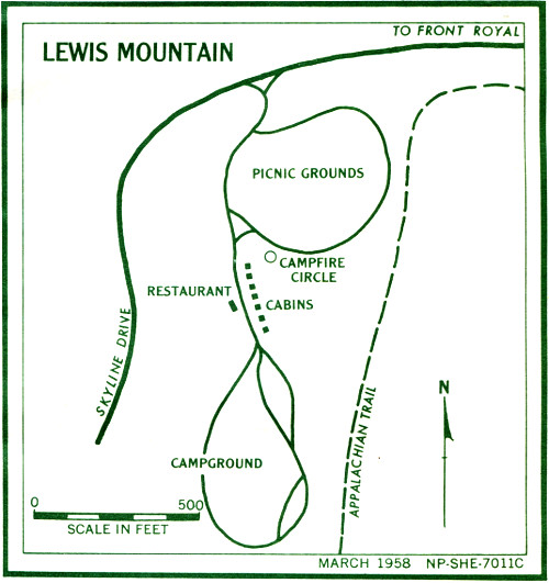 | 57.6 | Lewis Mountain. Coffeeshop, cabin accommodations for 24, Apr. through Oct. Camp and trailer sites, picnic grounds | 3,390 |