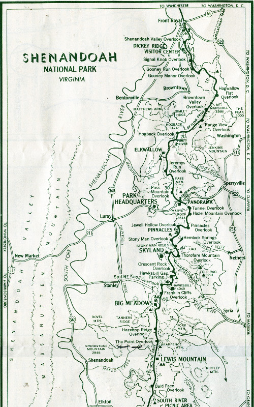 Shenandoah is one of seven National Parks east of the Mississippi River. Set in the heart of the Blue Ridge Mountains of Virginia, its most celebrated features are the succession of panoramas from the crest of the ridge and the lush beauty of the slopes. This is your park—we of the National Park Service hope you will help protect and preserve it so that many future generations may enjoy it. The superintendent and his staff are here to help make your visit a happy one.