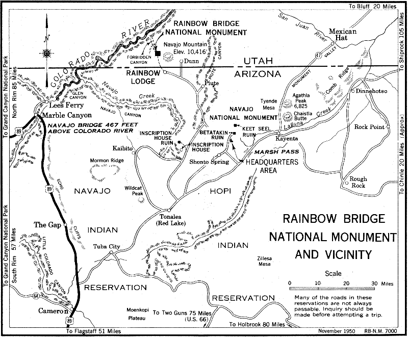 The bridge may be approached from three directions: 1. From U. S. No. 89 to Tuba City, Tonalea, and then Rainbow Lodge, 6 where mules are available for the 14-mile trail trip. 2. From Mexican Hat by boat down the San Juan and Colorado Rivers to Forbidden Canyon and 6 miles on foot to the bridge. 3. From Lees Ferry 68 miles upstream by boat to Forbidden Canyon and 6 miles on foot to the bridge.