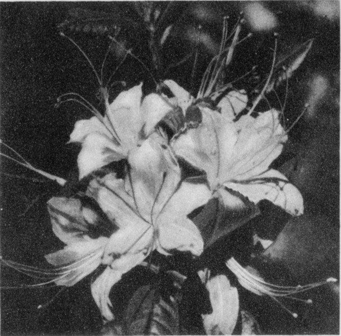 Spring is the favorite season of many in the Blue Ridge, for nowhere is there a greater show of native flowers. In mid-April the shadblow blooms, lacy white on the hillside; but the real procession starts in early May,—pink azalea, dogwood, redbud. In mid-May the flame azalea appears like fire through the undergrowth. Purple rhododendron, native of certain areas in Virginia and prevalent in North Carolina south from The Bluffs, are next to bloom (late May to mid-June). The mountain-laurel is everywhere and breaks during June. The white to pink rhododendron comes later in June and lingers well into July. There are many spring and summer blooming shrubs and ground flowers in the wild places along the Parkway. Among these is the galax,—glory ground cover of the Southern Appalachians.