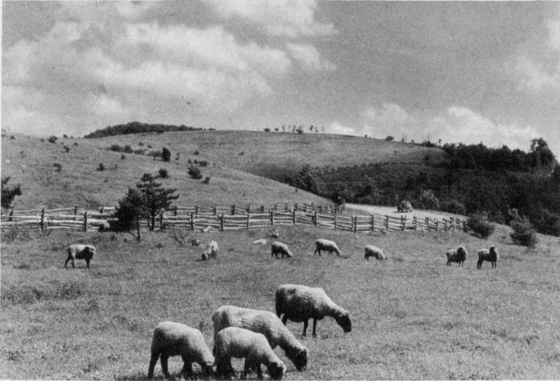 The northerly 60 miles shown finished on the map facing this page, like the section north toward Roanoke, thread a country remarkable for its mountain fields and pastures; but the country is more rugged, the Blue Ridge becoming more defined and higher. It is completed as to landscaping between the State Line and The Bluffs. A sandwich shop is open at Cumberland Knob.