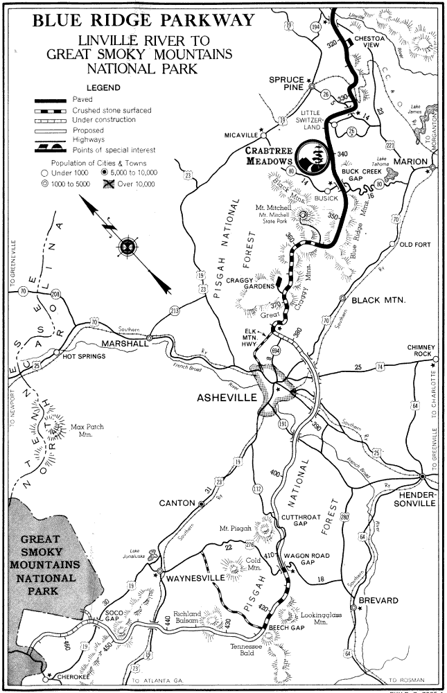 The Parkway between Linville Falls and Asheville traverses one of the great mountain sections of North Carolina where the Blue Ridge, the Blacks, and the Craggy Mountains merge. Mount Mitchell, 6,684 feet in elevation, and the highest peak in the East, is prominent from the Parkway. The large holdings of the Mitchell Division of the Forest Service and the Asheville Watershed have protected the area from despoliation.