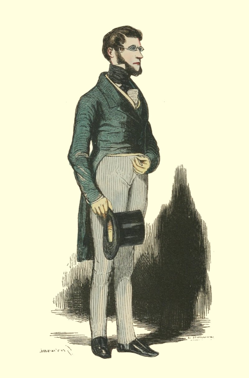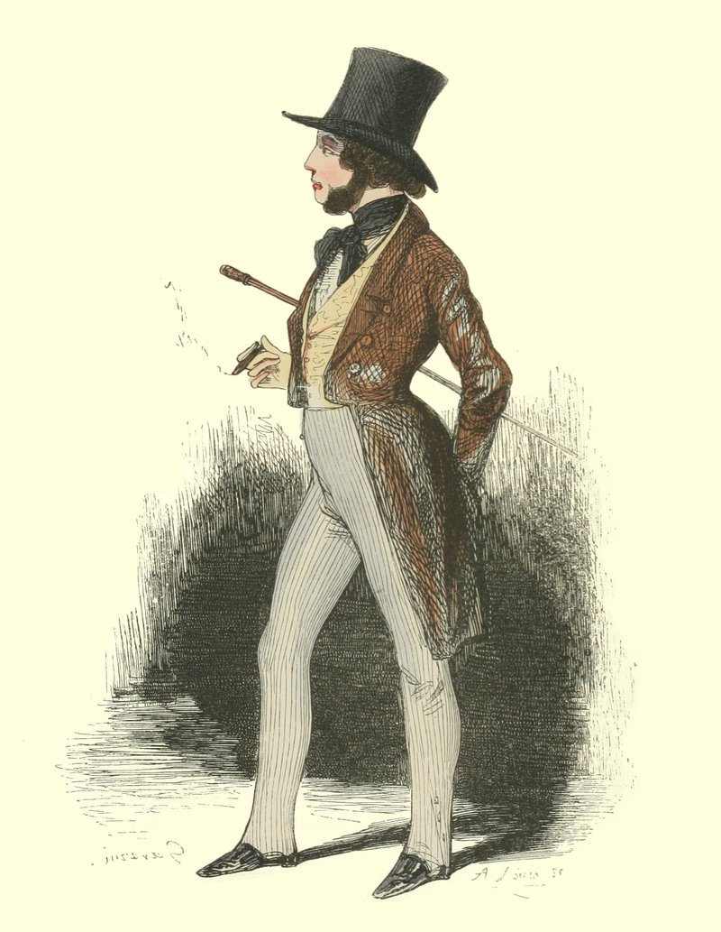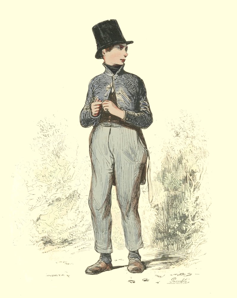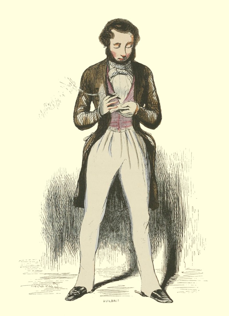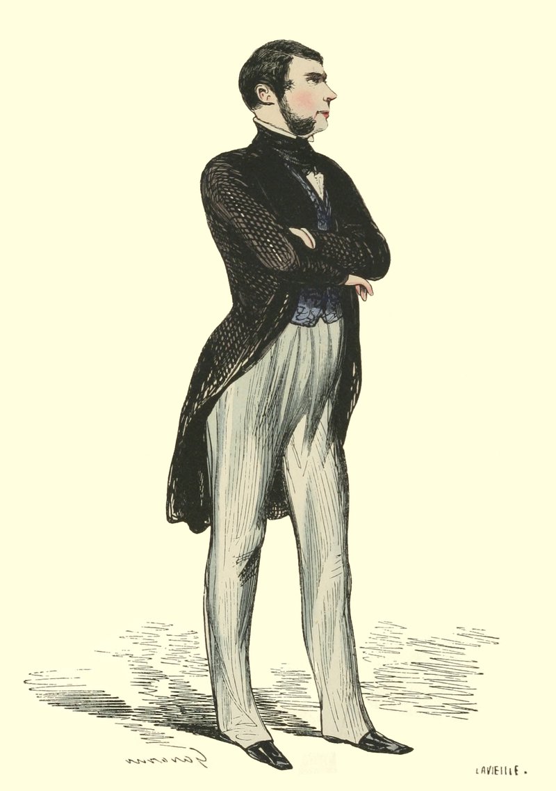 Pour qu’un jeune homme fût à la mode, il lui fallait un habit de drap fin ou de soie, suivant la saison, qui serrât exactement la taille et les bras, car on avait la prétention de paraître mince; l’embonpoint sentait la roture, et le ventre était à l’index, comme chose prohibée. L’élégant petit-maître sortait encore un gilet d’une étoffe chinée ou d’un drap chamois, des culottes de sénardine couleur jaune pâle ou gris de lin, des bas de soie à raies longitudinales et variées, des souliers étroits et lustrés à la cire luisante, des boucles d’argent taillées à facettes comme le diamant. L’été, on lui voyait un léger bambou à la main; l’hiver, il jetait sous son bras gauche un énorme manchon à longs poils soyeux, dans lequel il se serait bien gardé de cacher ses mains quand il se promenait aux Tuileries ou au Palais-Royal. N’oublions pas le chapeau de castor, qui, pendant un ou deux ans, fut d’une hauteur démesurée. Paris l’avait emprunté aux Hollandais. Je pourrais bien retracer ici ce qu’on appelait le négligé pour une certaine classe de jeunes fashionables du haut parage, auxquels on pouvait appliquer ce trait de Gilbert: