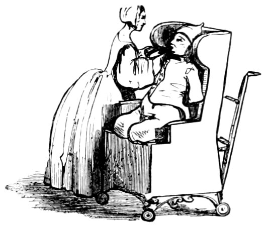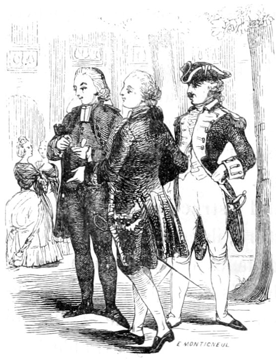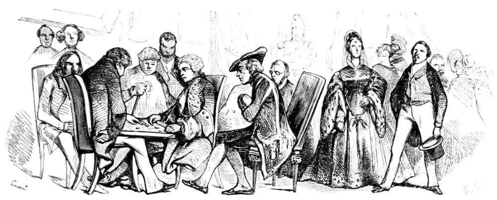 Les cheveux d’un jeune homme du temps, relevés à racines droites sur son front, couronnaient sa tête par un toupet crêpé, pommadé, poudré à frimas, et accompagné de deux rangs de boucles circulaires qui rejoignaient la queue enfermée dans un ruban de soie noire. Cette mode exigeait des papillotes deux fois par semaine avec frisure complète, opération fort longue, pendant laquelle jeunes et vieux, grands et petits, prenaient un singulier plaisir à écouter les nouvelles dont les artistes en perruques étaient toujours abondamment pourvus. Suivant la tradition, le pompeux Buffon cessait chaque matin de donner audience à son esprit, afin de prêter une oreille complaisante à la chronique du jour, racontée d’une manière originale et familière par son barbier en titre.