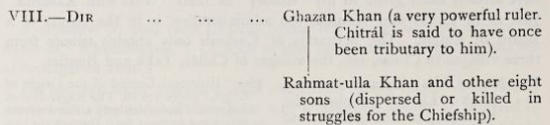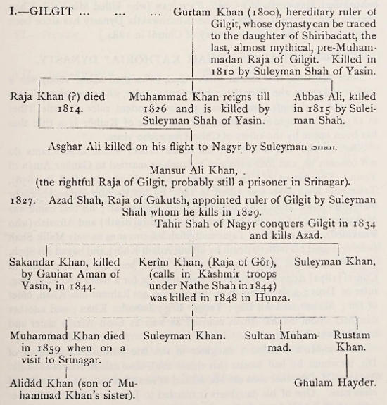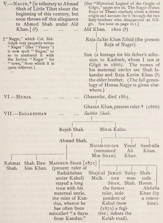 [110] “By the most recent account, Ghazan Khan, the son of Ghazanfar, has been killed by his own son, Muhammad Khan. Muhammad Khan’s mother was the sister of Zafar Khan, the ruler of Nagyr. She was killed by her father-in-law, Ghazanfar, and thrown over a precipice from her house. Ghazan Khan treacherously killed his paternal uncle, Abdullah Khan, ruler of Gojál, who unsuspectingly met him. On ascending the throne, Ghazan Khan is also said to have poisoned his ailing full brother, Bukhtawar Shah, and another (by a different Sayad mother) Nanawal Shah. The fratricidal traditions of Hunza and of the Khush-waqtia family of Yasin have now been somewhat thrown into the shade by the parricide of Muhammad Khan. The father of Ghazan Khan, Ghazanfar, is said to have died from the effects of a suit of clothes, impregnated with small-pox, sent to him by his daughter, the full sister of Ghazan Khan, who was married to Mir Shah of Badakhshan, in order to accelerate her brother’s accession to the throne. The father of Ghazanfar, Sullum, also poisoned his own father. This state of things is very different from the gentle rules and traditions of Nagyr, whose aged Chief, Zafar Khan, has nineteen sons, and who sent his rebellious eldest son. Muhammad Khan (whose mother was a full sister of Ghazan Khan of Hunza) to Ramsu in Kashmir territory, where he died. He was married to a daughter of his maternal uncle, and tried to sell some of his Nagyr subjects into slavery, against the traditions of that peaceful country, in consequence of which his father, Zafar Khan expelled him.” (See Part referring to the History and Customs of Hunza and Nagyr.) Yet it is this patriarchal, loyal and God-fearing Záfar Khan, whose letter to me I published last year, whom we accused of kidnapping and aggressiveness, so that we might take his country.