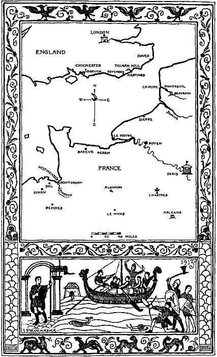 The intention of the expedition was almost certainly to make a Norman port. Once in the Channel the square-rigged ships could not beat into a wind that was too westerly for them or too much south of west, and their land-fall was at some point upon the coast of Ponthieu, of which district Count Guy was the lord. The point upon the coast of Ponthieu where the ships beached, or rather cast anchor in the shoal water, we may presume to have been the right bank of the estuary of the Somme, for it is the most convenient entry and has some shelter from a southerly wind; but all that flat sandy coast gave good opportunity for landing from such vessels, and the fleet may have made the Bay of Authie or even the mouth of the Canche. But the choice is not a wide one, for the coast of Ponthieu did not extend beyond the Canche. If the Somme were the point of entry, it has this historical interest: that Harold would then have found himself fated to land at the very point from which William two years later was to sail for the invasion of England. Count Guy seized Harold for ransom, something of a formality, though a formality which was to be of formidable consequence. He takes Harold and his suite to “Belrem”—the place to-day called Beaurain. Here the Tapestry follows Wace very closely, for it is Wace who tells us that Harold was recognised by a fisherman, who sent for Count Guy.