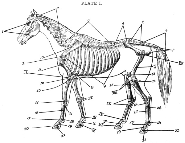 7. | Pelvic or hip bones. | 21. | Os Naviculare, small sesamoid, or shuttle bone. (This bone can be plainly seen Plate VII). |