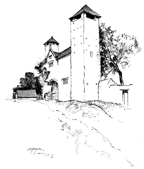 Pen-drawing is ruled by expediency more, perhaps, than any art. I shall not say that one method is more right than another in the management of textures, or in the elaboration or mere suggestion of detail, for line work is, to begin with, a purely arbitrary rendering of tones. There is nothing like line in nature. Take up an isolated brick; it does not suggest line in any way. Build it up with others into a wall, and you can in pen and ink render that wall in many ways that will be equally convincing and right. It may be expressed in terms of splatter-work, which can be made to represent admirably a wall where the bricks have become welded into an homogeneous mass, individually indistinguishable by age, or of vertical or horizontal lines that may or may not take account of each individual brick and the joints of the mortar that [Pg 136] binds the courses together. Crosshatching, though a cheap expedient and a decaying convention, may be used. But to lose sight of ordinary atmospheric conditions is no more privileged in pen-work than in paint. This is not by any means unnecessary or untimely advice, though it should be. The fact of using a pen instead of a brush does not empower anybody to play tricks with the solar system, though one sees it constantly done. One continually sees in pen-drawing the laws of light and shade set at naught, and nobody says anything against it—perhaps it looks smart. Certainly the effect is novel, and novelty is a powerful factor in anything. But to draw a wall shining with a strong diffused light which throws a great black shadow, is contrary to art and nature both. “Nature,” according to Mr. Whistler, “may be ‘creeping up,’ but she has not reached that point yet. When one sees suns setting behind the east ends of cathedrals, with other vagaries of that sort, one simply classes such things with that amusing erratum of Mr. Rider Haggard’s, in which he describes a ship ‘steaming out of the mouth of the Thames, shaping her course toward the red ball of the setting sun.’” But though the instance is amusing, the custom is apt to pall. [Pg 137]