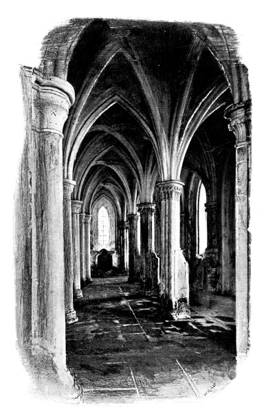 Another method is used for half-tone work. A photograph is mounted upon cardboard, and may be worked upon in brushwork with body-colour to any extent, either for lightening the picture or for making it darker. For working upon the ordinary silver-print an admixture of ox-gall must be [Pg 130] used or the pigments will not “take” upon the sensitized paper.[1] The illustration, The Ambulatory, Dore Abbey, is from a photograph, worked upon in this manner. The photo was so dark and indefinite that something was necessary to be done to show the springing of the arches and the relation of one pier to another. Chinese white was used in the manner described above, and the arches outlined in places by scratching with the sharp point of a penknife.