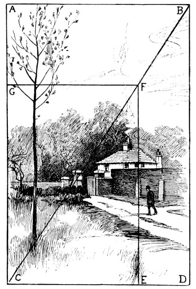 The proportions a drawing will assume when reduced may be ascertained in this way. You have, say, a narrow upright drawing, as shown in the above diagram, and you want the width reduced to a certain measurement, but having marked this off are at a loss to know what height the reproduction will be. Supposing it to be a pen-drawing, vignetted, as most pen-drawings are; in the first place, light pencil lines touching the farthest projections of the drawing should be ruled to each of its four sides, meeting accurately at the angles A, B, C, D. This frame being made, a diagonal line should be lightly ruled from upper to lower corner, either—as shown—from B to C, or from A to D. The measurement of the proposed reduction should then be marked off upon the base line at E, and a perpendicular line ruled from it to meet the diagonal. The [Pg 134] point of contact, F, gives the height that was to be found, and a horizontal line from F to G completes the diagram, and gives the correct proportions of the block to be made.
