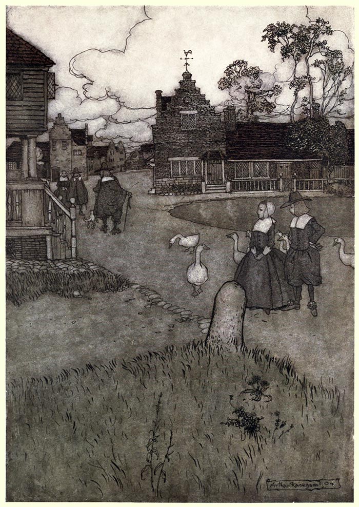 He had now entered the skirts of the village. A troop of strange children ran at his heels, hooting after him, and pointing at his grey beard. The dogs, too, not one of whom he recognised for an old acquaintance, barked at him as he passed. The very village was altered; it was larger and more populous. There were rows of houses which he had never seen before, and those which had been his familiar haunts had disappeared. Strange names were over the doors—strange faces at the windows—everything was strange. His mind now misgave him; he began to doubt whether both he and the world around him were not bewitched. Surely this was his native village, which he had left but the day before. There stood the Kaatskill Mountains—there ran the silver Hudson at a distance—there was every hill and dale precisely as it had always been. Rip was sorely perplexed. “That flagon last night,” thought he, “has addled my poor head sadly!”