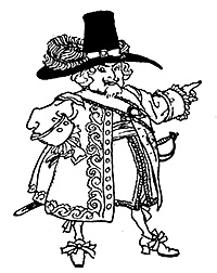 On entering the amphitheatre, new objects of wonder presented themselves. On a level spot in the centre was a company of odd-looking personages playing at ninepins. They were dressed in a quaint, outlandish fashion; some wore short doublets, others jerkins, with long knives in their belts, and most of them had enormous breeches, of similar style with that of the guide’s. Their visages, too, were peculiar; one had a large beard, broad face, and small piggish eyes; the face of another seemed to consist 13 entirely of nose, and was surmounted by a white sugar-loaf hat, set off with a little red cock’s tail. They all had beards, of various shapes and colours. There was one who seemed to be the commander. He was a stout old gentleman, with a weather-beaten countenance; he wore a laced doublet, broad belt and hanger, high-crowned hat and feather, red stockings, and high-heeled shoes, with roses in them. The whole group reminded Rip of the figures in an old Flemish painting, in the parlour of Dominie Van Shaick, the village parson, and which had been brought over from Holland at the time of the settlement.