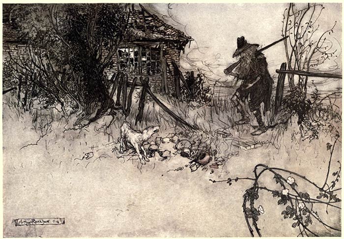 Rip’s sole domestic adherent was his dog Wolf, who was as much hen-pecked as his master; for Dame Van Winkle regarded them as companions in idleness, and even looked upon Wolf with an evil eye, as the cause of his master’s going so often astray. True it is, in all points of spirit befitting an honourable dog, he was as courageous an animal as ever scoured the woods—but what courage can withstand the evil-doing and all-besetting terrors of a woman’s tongue? The moment Wolf entered the house his chest fell, his tail drooped to the ground or curled between his legs, he sneaked about with a gallows air, casting many a sidelong glance at Dame Van Winkle, and at the least flourish of a broomstick or ladle he would fly to the door with yelping precipitation.