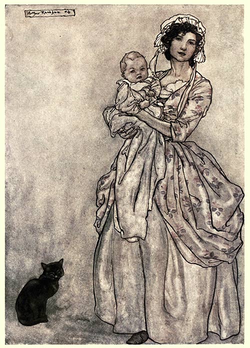 The bystanders began now to look at each other, nod, wink significantly, and tap their fingers against their foreheads. There was a whisper, also, about securing the gun, and keeping the old fellow from doing mischief, at the very suggestion of which the self-important man in the cocked hat retired with some precipitation. At this critical moment a fresh, comely woman pressed through the throng to get a peep at the grey-bearded man. She had a chubby child in her arms, which, frightened at his looks, began to cry. “Hush, Rip,” cried she, “hush, you little fool; the old man won’t hurt you.” The name of the child, the air of the mother, the tone of her voice, all awakened a train of recollections in his mind. “What is your name, my good woman?” asked he.21