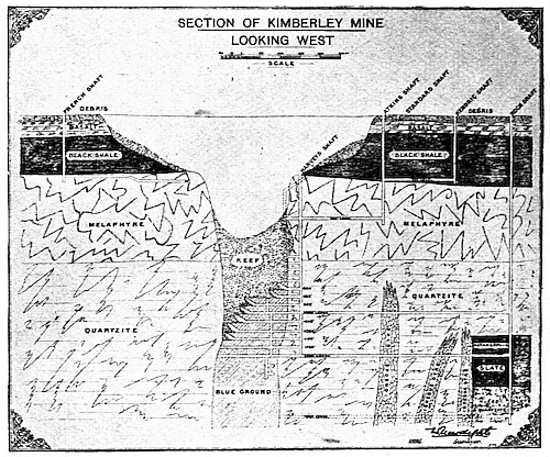 In the year 1896 I spent nearly a month at Kimberley. Mr. Gardner F. Williams,[7] General Manager of the De Beers Consolidated Mines, and the Managers of neighbouring mines, did their utmost to assist me in my inquiries and to ply me with valuable information. I had full access to all the workings, above and below ground, and was able to examine at leisure their stock and take extracts from their books.