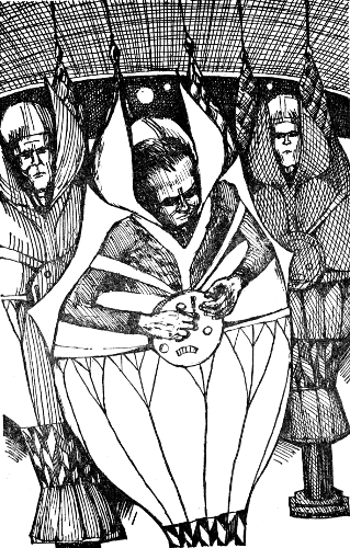 The suit held Grunfeld erect, his arms at his sides—the best attitude, except he was still facing forward, for taking high G, providing the ship herself didn't start to tumble. Only the cheekpieces and visor hadn't closed in on his face—translucent hand-thick petals as yet unfolded. He felt the delicate firm pressure of built-in fingertips monitoring his pulses and against his buttocks the cold smooth muzzles of the jet hypodermics that would feed him metronomic drugs during the high-G stretch and stimulants when they were in free-fall again. When.