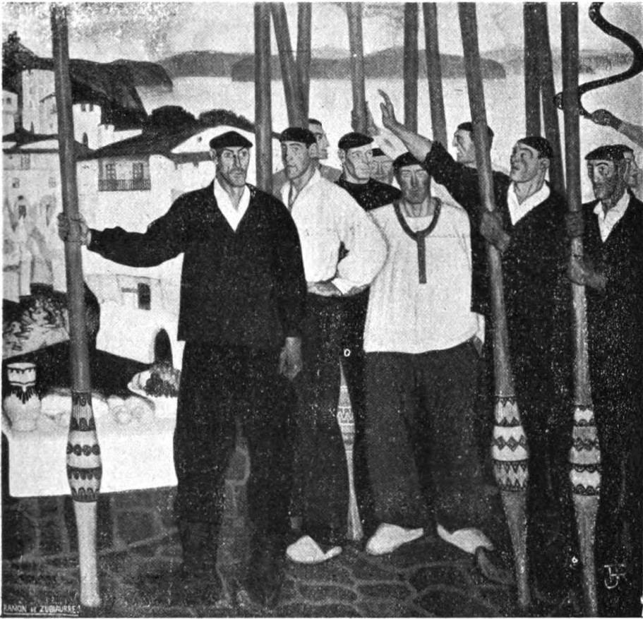 Vedlos ahí. Son los remeros de San Sebastián. ¿No los conozco yo tal vez, desde la infancia ingenuamente picaresca?... Los rostros cetrinos y angulosos me son familiares. Manu, Gabriel, Joshé, Telesh, Quirico, Torre, Pepe, Inashio, Mala Cara... De pronto ha sonado la señal. Y de repente, en una verdadera locura, en un arranque vertiginoso y exaltado, las dos traineras rivales han embestido de frente como dos cosas vivas, como dos caballos de raza que dan un brinco de salida. Las trece camisas blancas de cada trainera figuran ser trece puntos de delirio. ¡Señor, qué bello impulso de pugilato! ¡Qué entusiasta aspiración de triunfo! ¡Qué noble coraje, tendido en una locura de vencer! El agua se arremolina en torno a las traineras. Un{48} ancho margen de espuma rodea y persigue a los veloces pugilistas. Y mientras los trece remeros se acompasan en un ritmo tenso e igual, el patrón, de pie en la popa, hace con una mano, dirigiéndose a sus hombres, un gesto casi maniático y casi angustioso que parece decir: ¡Más, todavía más, muchachos; siempre más, por vuestra vida, por vuestro honor, por el honor de vuestras mujeres y vuestros amigos!