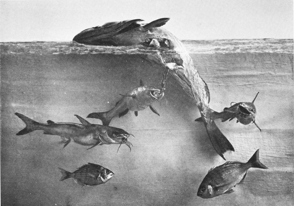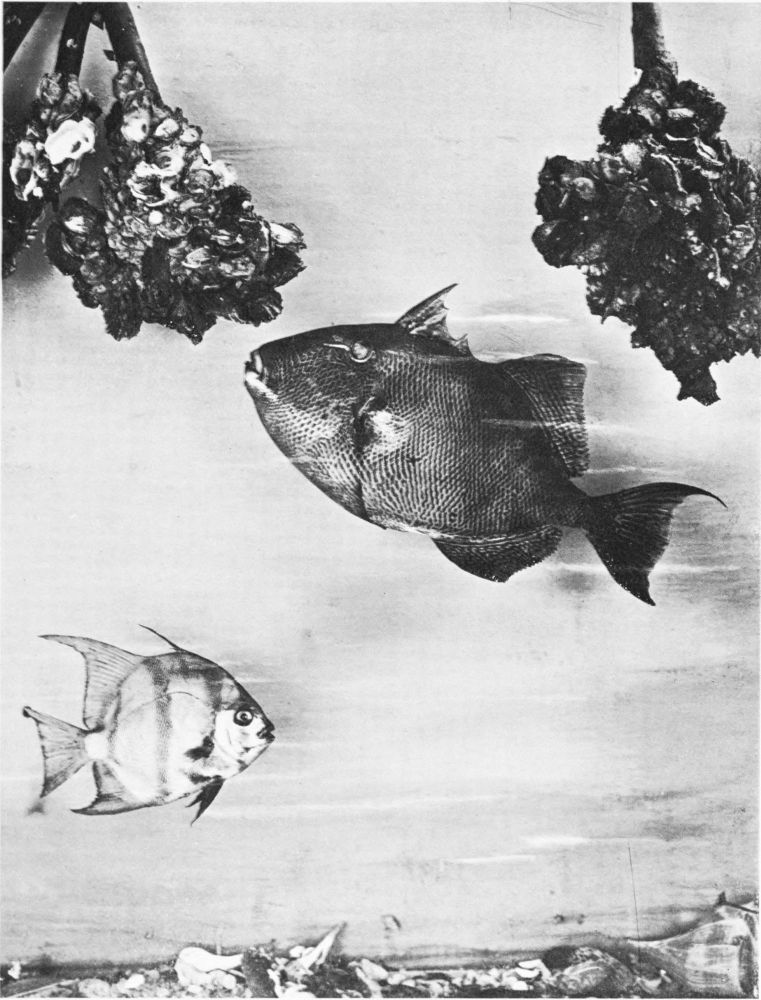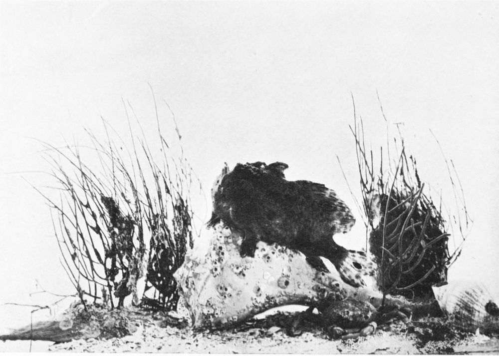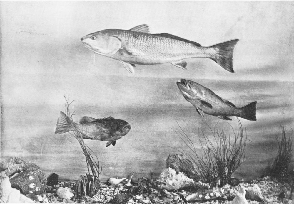 There are but one or two really successful photographers of living fish under water, and these artists must obviously confine their efforts to comparatively small fish in the confinement of aquarium tanks. Now, a considerable observation of fish at home and abroad under every variety of conditions has persuaded me (though I hardly expect the statement to pass unchallenged) that the narrow confines of the aquarium tank tend to cramped and unnatural attitudes in the subjects; and this contention seems to me abundantly substantiated by a careful comparison of the otherwise excellent photographs from time to time published, and the best studies of the best fish painters. My own system of illustration combines the two, and in great measure, I venture to think, obviates many of the faults of both. Constant observation of the fish in their natural habitat impresses on me their every attitude, and, while unfortunately not possessed of the necessary talent to transfer these groups to canvas, there is no insuperable difficulty in the way of pegging the various subjects in just the positions they assumed before my eyes an hour or two earlier. The camera does the rest.{14}