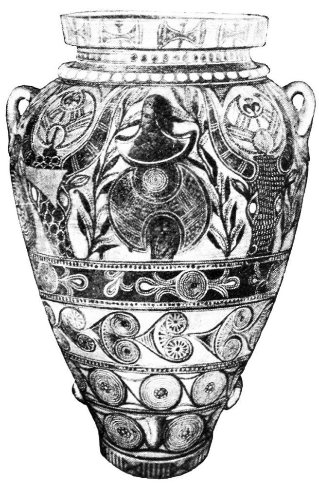 The excavations in Northern Greece, i.e., in North{2} Boeotia, Phocis and above all Thessaly, have introduced us to a purely Neolithic civilization. Here alongside of the two simpler prehistoric techniques, unornamented (monochrome) and incised ware, was discovered, even in the oldest strata, a richly developed painted style, with linear ornaments painted either in red on vases with a white slip or in white on vases made red by firing. The monochrome, red or black vases are often brilliantly polished and of excellent workmanship. In the later layers of the Stone Age finds this civilization differs considerably according to locality. One class of painted (and incised) vases is very prominent: it was found chiefly at Dimini and Sesklo, and shows quite a new principle of decoration (Fig. 1). It combines curvilinear patterns, especially the spiral motive, with rectilinear decoration (zig-zag, step pattern, chequers, primitive maeander, etc.); the colouring varies, white on red, black on white, brown on yellow. Side by side with this style we find in other places the greatest variety of painted and unpainted vases: even polychrome decoration appears. In the early Bronze Age all this splendour vanishes and gives place to the production of coarse unpainted ware.