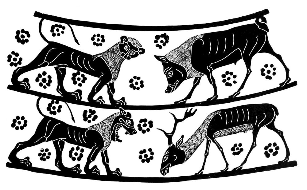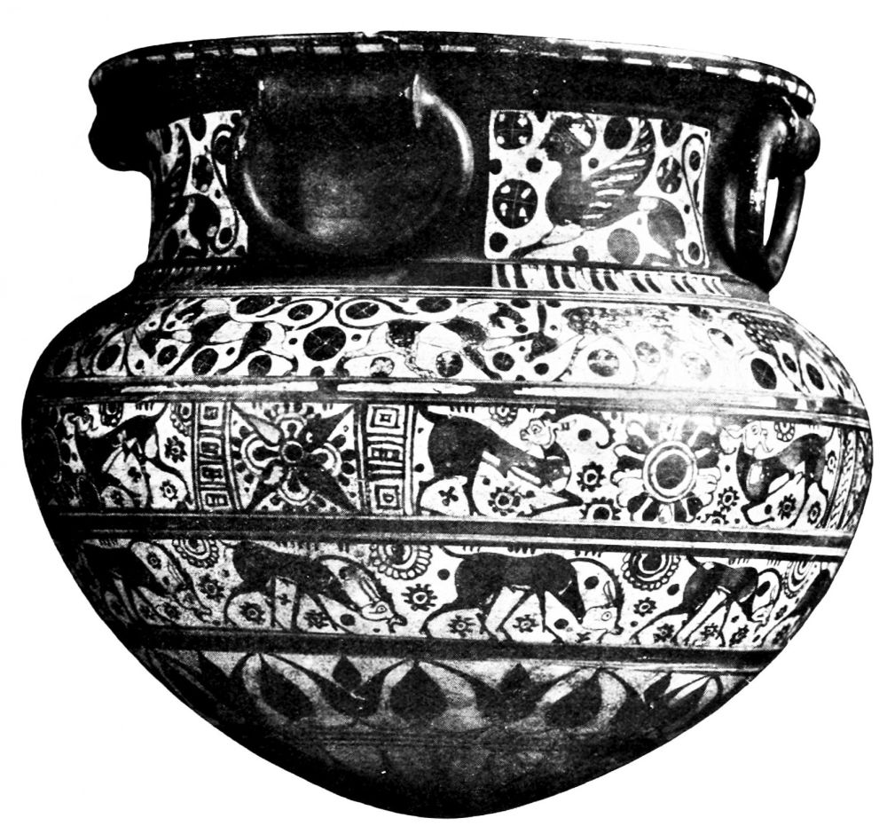 According to these early vase finds one has thus to picture to oneself the beginnings of ceramic art. First, the most essential household vessels are fashioned by hand out of imperfectly cleansed clay, and burnt black in the open fire, and before long the outer surface is also polished, probably with smooth stones. Rectilinear ornaments are pressed or incised into the soft clay, and by degrees the method of filling and indicating the incised lines by a white substance is learned; the clay is also treated plastically, for instance channelled. Gradually the clay is made less impure, is more cleanly polished and more evenly baked in the oven, and by the actual firing has various colours, red, black, grey, yellow and brown, imparted to it. Thus a ground is also obtained for painting, on which the rectilinear ornaments are imposed with colour. Greater solidity and brighter colouring are obtained by covering the vase with a slip, which moreover sets off the painting excellently. The invention of the wrongly styled ‘varnish,’ a black colour glaze which, though technically undeveloped, appears even in North Greece of the Stone Age, is of the highest importance for the whole history of Greek vase-painting. The forms are primitive, little articulated, but already very various: the decoration covers uniformly almost the whole vase.