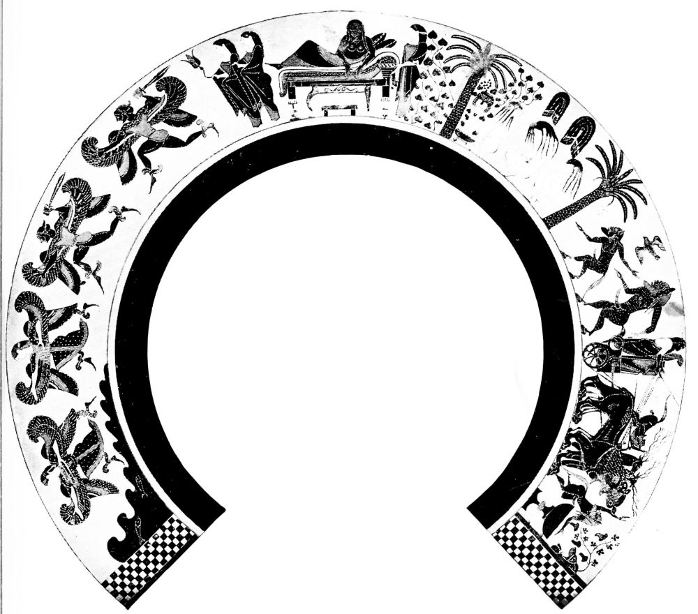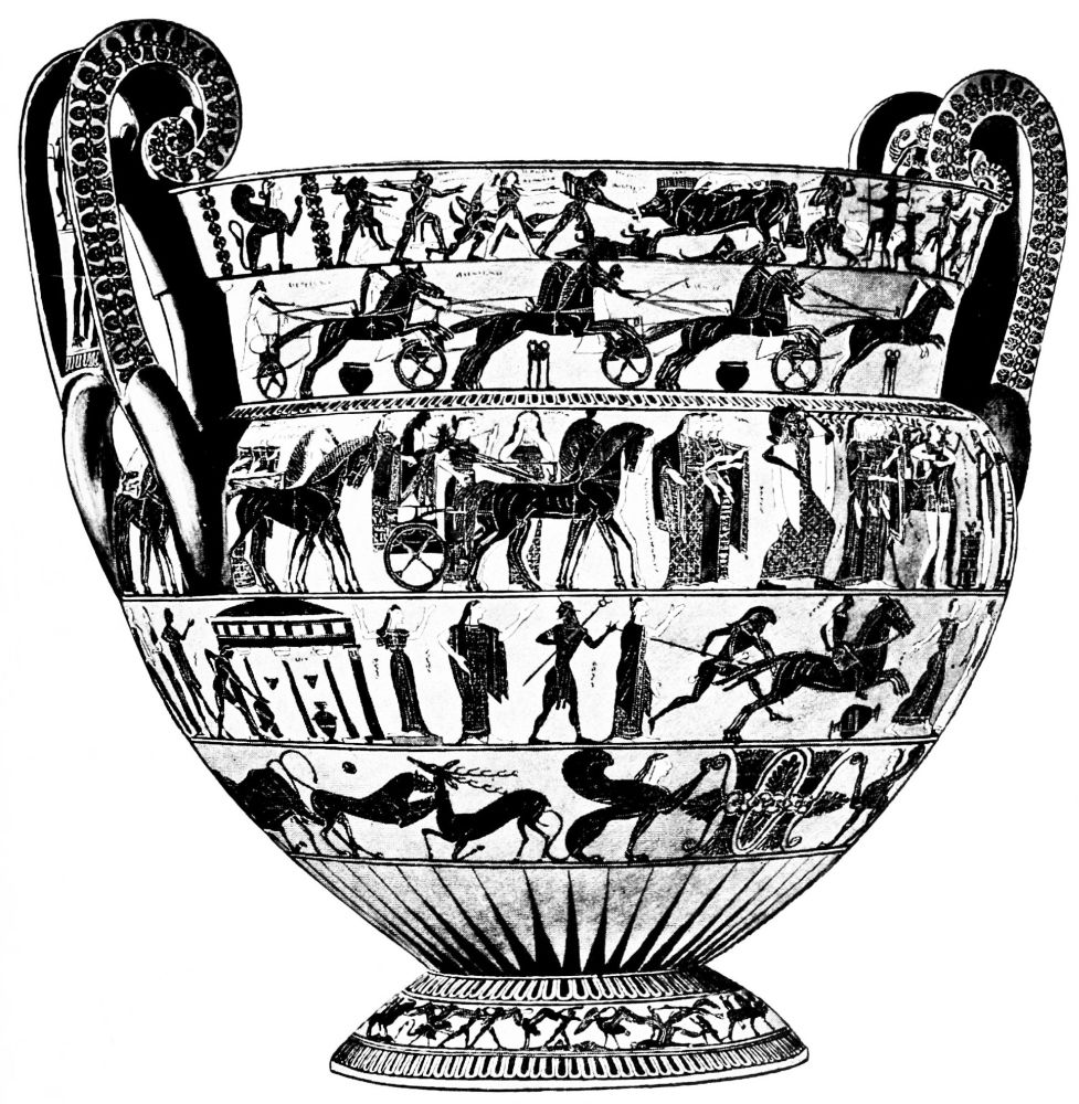 A HISTORY of Greek vase-painting has been for a long time a desideratum of students of Greek art and antiquity. Many years ago I planned such a work, but the difficulty of the necessary illustration caused the plan to break down. In the meantime an extensive literature has grown up on the subject, mainly in German, but with contributions from other countries. In his first chapter Dr. Buschor has shewn how the result of excavation in Greece and Italy has been to throw our starting-point further and further back, until it lies in the Neolithic age. But it is not only in regard to the earlier phases of Greek vase-painting that research has brought light: the red-figured vase-painting which is one of the most perfect fruits of Greek art in the fifth century has been far more minutely and intensively studied. The result has been to fix the outlines, and more than the outlines, of the history of a fourth great branch of Greek artistic activity; the history of architecture, of sculpture and of coinage having been already thoroughly investigated. And this fourth branch is not merely vase-painting; but since the fresco and other paintings of the great age of Greece have almost entirely perished, we may fairly say that it includes almost all that we can ever know of the history of early Greek painting. Vase-paintings can but feebly image the colouring of the great painters of Greece; but they can give us invaluable information as to the principles of grouping and perspective adopted by them; they can reflect the extreme beauty of their figure-drawing; and they can shew us how they treated subjects from the vast repertory of Greek mythology and poetry.{viii}