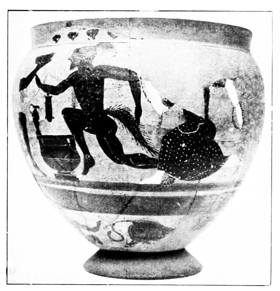 Into the early Bronze Age fall the finds from the earliest layers at Troy. In the unalterable faith that he was discovering the world of Homer, with the strong and weak points of a dilettante, Heinrich Schliemann began to dig at Hissarlik, and in the excavations of 1871, 1878, 1890 and 1893 Dörpfeld and he investigated the rubbish hill, which has become so famous, the nine superimposed settlements of which represent as many successive civilizations down to Roman times. The numerous ceramic finds of the five lowest layers show the transition from rude hand-made and ill-baked ware with impressed linear patterns to ever more developed stages. The potter’s wheel and oven finally succeed in producing brilliant red, black, grey, brown vases of the finest technique. The variety of shapes is very great, some are already quite developed; the imitation of metal forms is to be traced here and there. A notable speciality is found in the so-called Face-urns (Fig. 2), rude imitations of the human form, produced by adding eyes, nose, mouth, ears, nipples and navel; and there are also other vase-types, which are not repeated in Western Greece. Painting is rare, the vases are either monochrome or adorned with incised linear ornaments, which are often applied in the manner of necklaces, or divide the vase vertically.