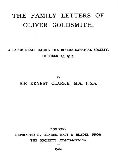 The story of the incubation, preparation and final publication of the Edition of 1801 is long, complicated and tedious. It does not however particularly concern us here, except in so far as we are indebted to Bishop Percy for having collected practically all the original letters written by Goldsmith to members of his family, and for having in his disappointment after they were published, put them away with the other documents concerning the publication, in a bundle which has been practically unexplored ever since. Setting aside therefore any questions as to the merits or demerits of what has been consistently labelled by subsequent commentators as the “Percy Memoir,” we are left with the consideration of the point to which I had intended to address myself exclusively, the epistolary style of Oliver Goldsmith himself. Percy could not resist the temptation of editing his friend’s letters—not much, it is true, but still enough to induce us to turn to the originals, as we are now enabled to do through the kindness of their present possessor, Miss Constance Meade.