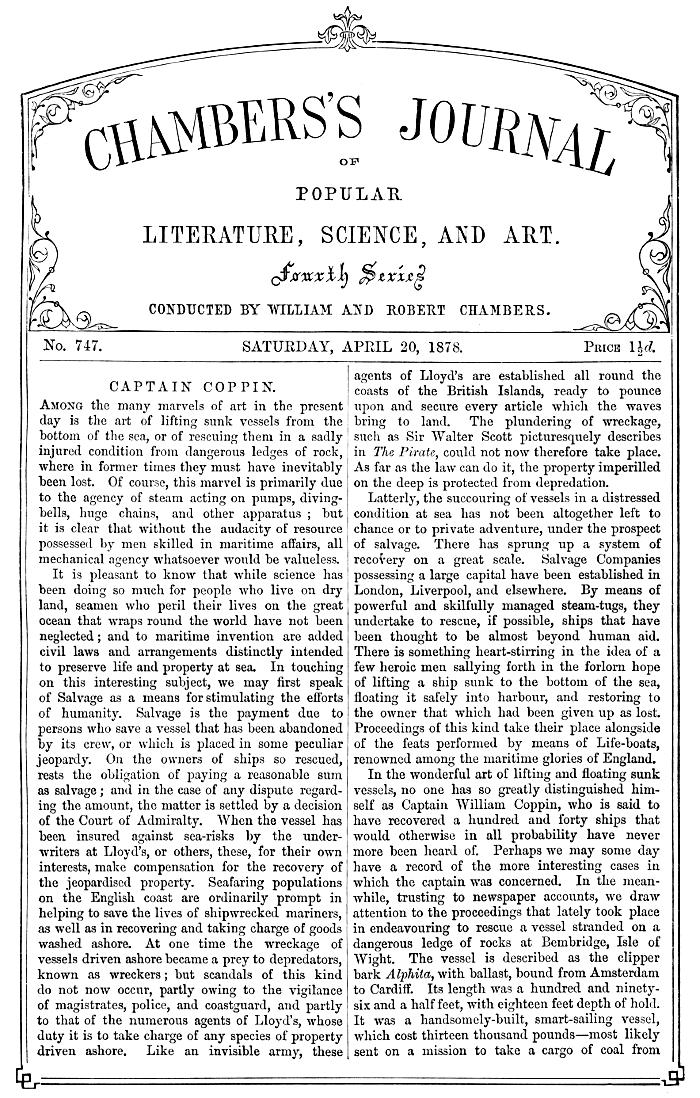 There were grave consultations on the matter by the owners and underwriters. The vessel was too valuable even with all her injuries to be abandoned outright. It was resolved to employ a Salvage Company to endeavour to get the vessel floated into port. A vigorous attempt of this kind was made, and it failed. The Alphita still stuck. As if all hope of recovery was gone, and not wishing to be plagued any more about it, the underwriters sold the vessel where she lay for two hundred pounds. There was a bargain. A thirteen thousand pound vessel disposed of for the paltry sum of two hundred pounds. The purchase, however, was a pure hazard. If the vessel could not be got off, it was not worth anything. Already, an immense deal of trouble had been taken to float the Alphita, and it was of no use. Two hundred pounds was accordingly not a bad offer. The purchasers were the Salvage Steam-ship Company of London, of which Captain Coppin is the managing director.