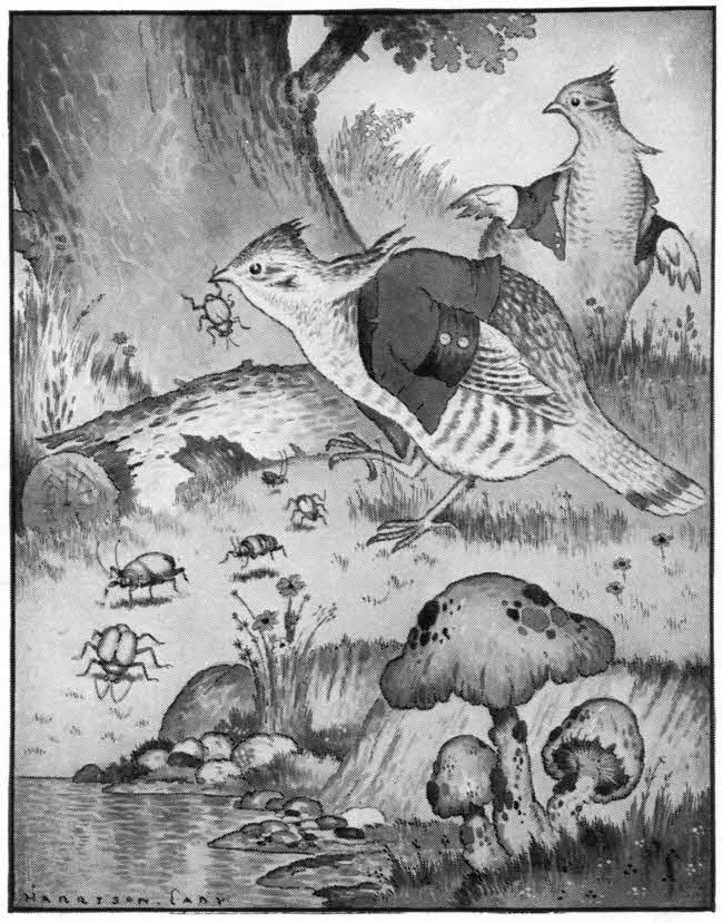 Many times had Tommy been startled by having the handsome bird spring into the air from almost under his feet, with a noise of wings that was enough to scare[29] anybody. It was because of this and the noise of his drumming that Tommy called him Thunderer.