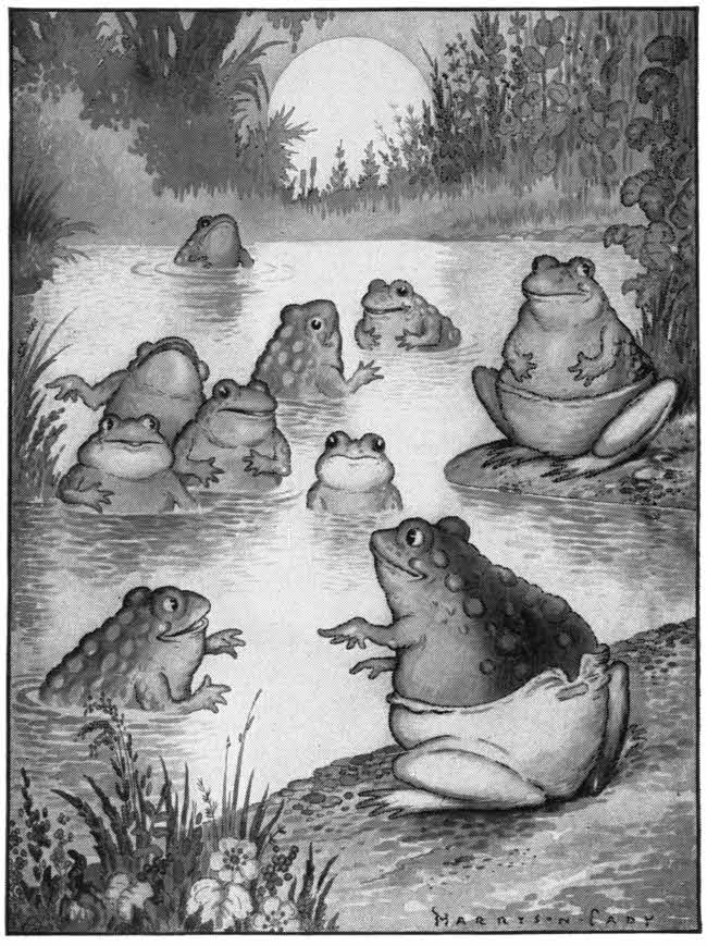 Sometimes they went frogging along the marshy shores of a little pond. This was even more fun than fishing. It was great sport to locate a big frog by the sound of his deep bass voice and then[105] softly steal up and cut a “chugarum” short, right in the middle. Then when he had eaten his fill, it was just as much fun to keep on hunting them just to see them plunge with long frightened leaps into the water. It tickled Tommy immensely, and he would hunt them by the hour just for this.
