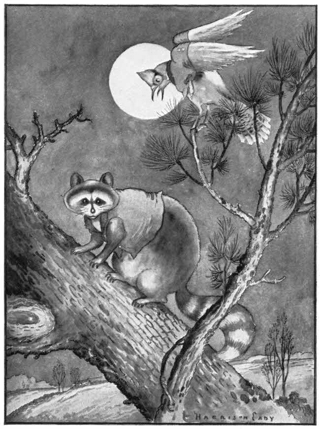 When he awoke, the first stars were beginning to twinkle down at him from the sky, and Black Shadows lay over the Green Meadows. He found that he could see quite as well as in the light of day, and, because he was already hungry again, he started out to look for something to eat. Something inside warned him that he must watch out for danger now just as sharply as before, though the Black Shadows seemed to promise safety. Just what he was to watch out for he didn’t know, still[16] every few steps he stopped to look and listen.
