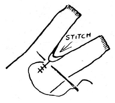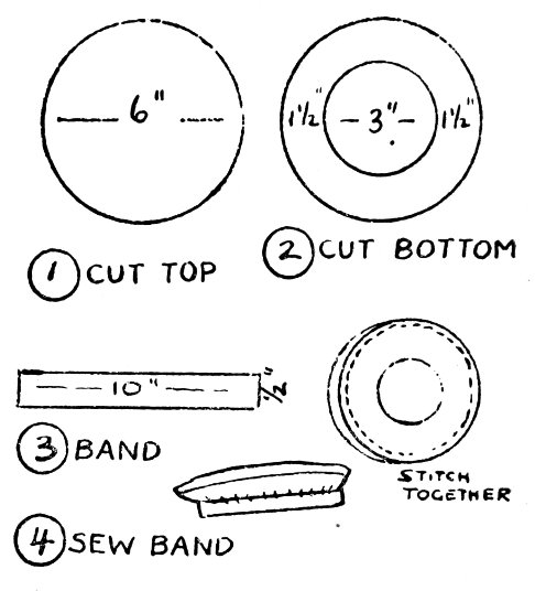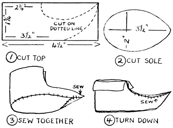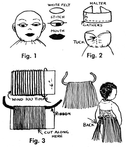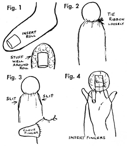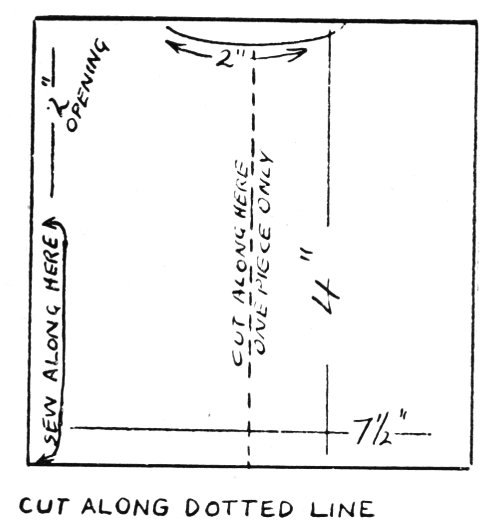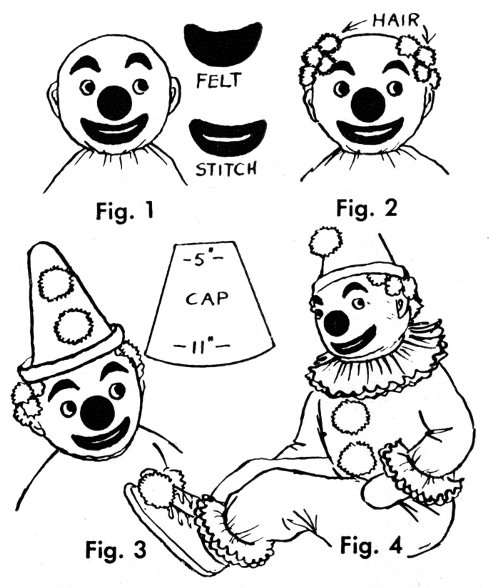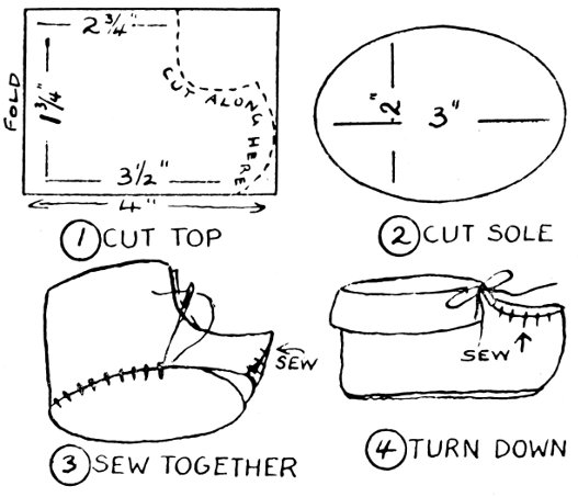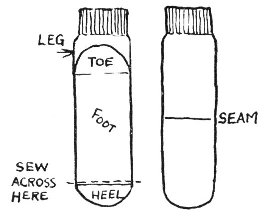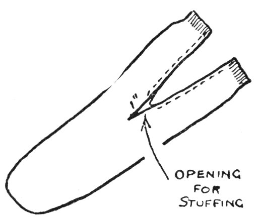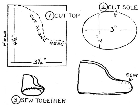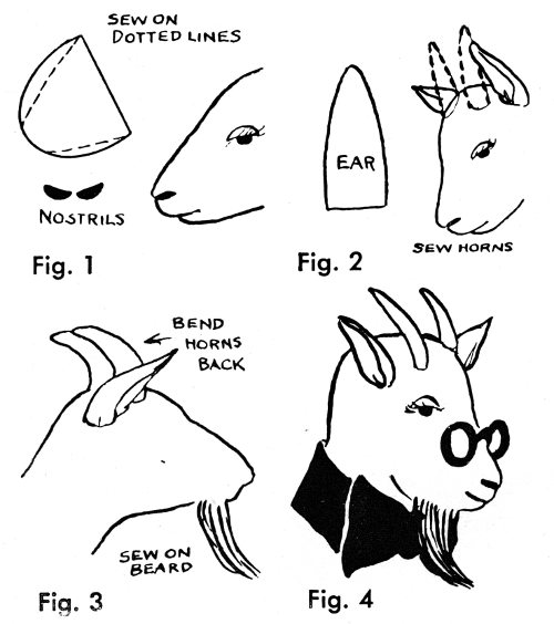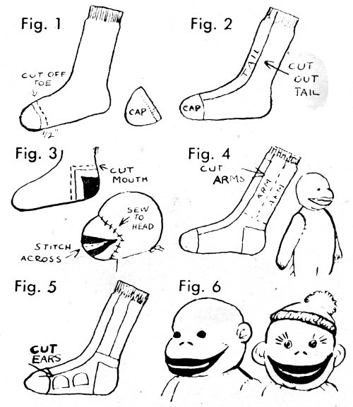 MOUTH: Cut the heel from the sock, leaving a brown edge around the white. Fasten on lower part of face, whipping around the bottom; stuff and finish sewing around top. The mouth can be improved by a running stitch of either black or white across the middle.