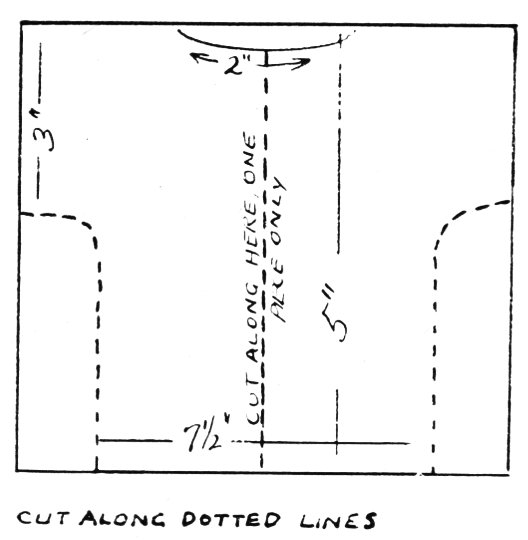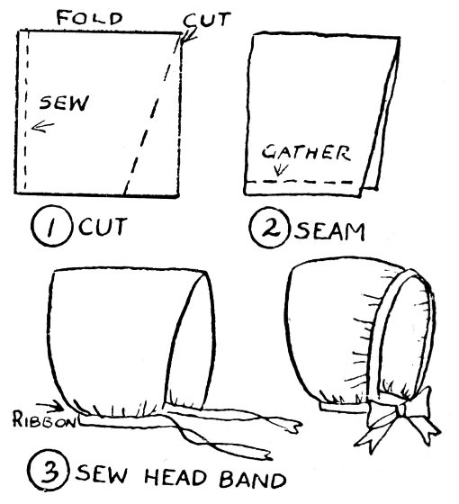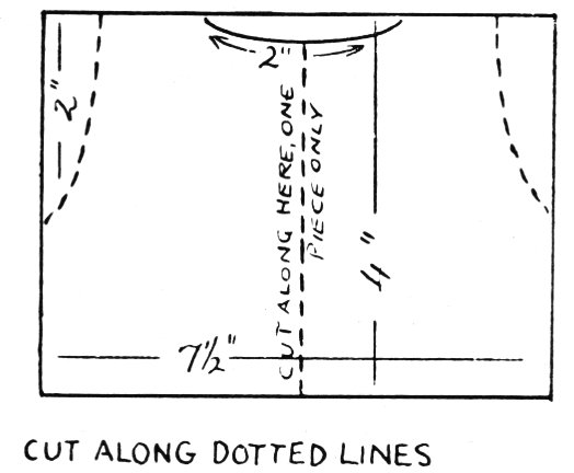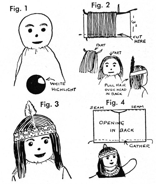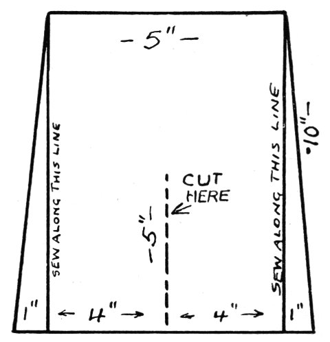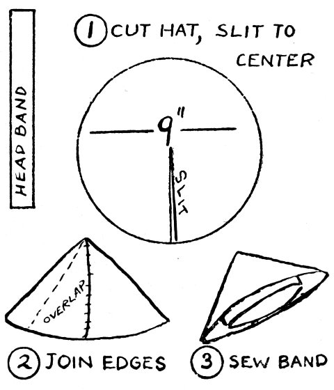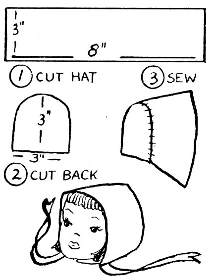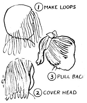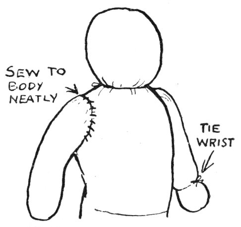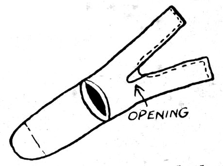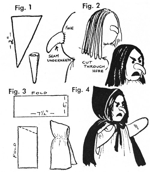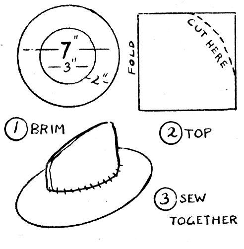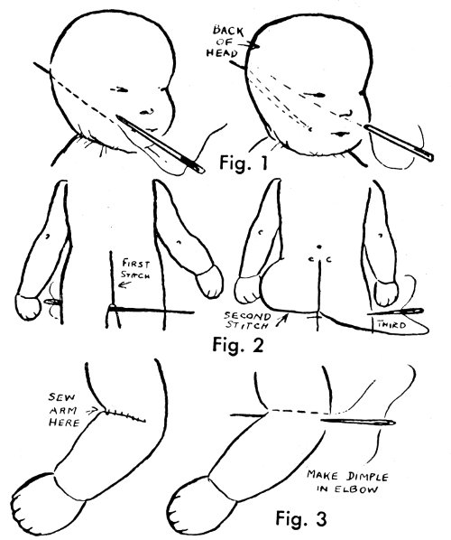 MOUTH: Cut the heel from the sock, leaving a brown edge around the white. Fasten on lower part of face, whipping around the bottom; stuff and finish sewing around top. The mouth can be improved by a running stitch of either black or white across the middle.