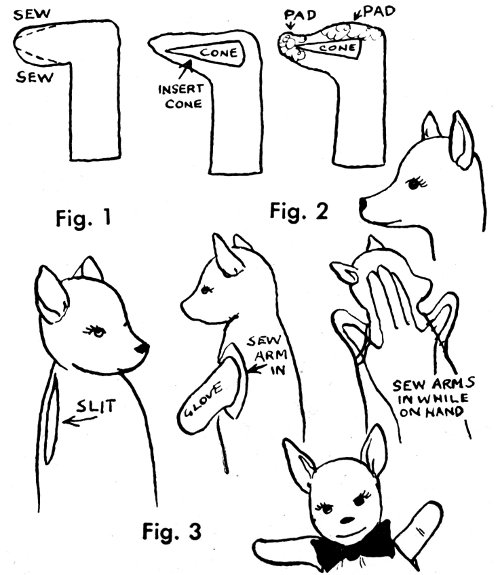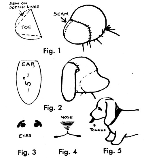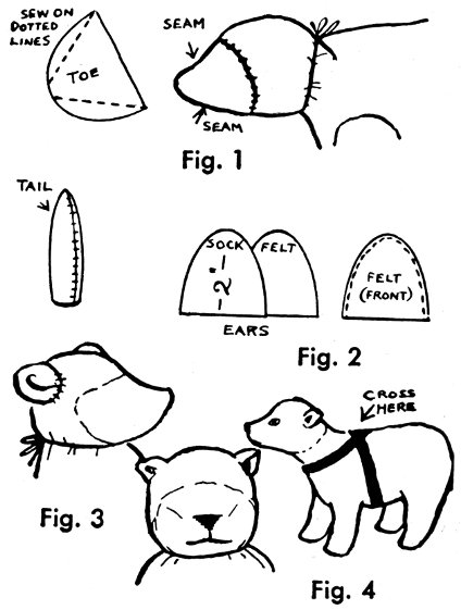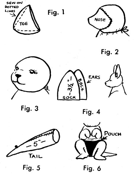NOSE: Cut toe from sock, insert a small circle of cardboard and stuff (Figure 1). This makes the snout. Sew to front of head.