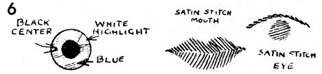 EYES: The eyes can be made either by sewing on buttons or by embroidering them with black thread. In this same operation a nose can be indicated by two small embroidered marks.