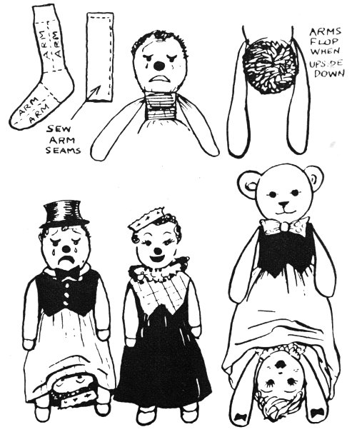 All you need are some socks, scrap materials for stuffing and clothing plus a steady eye to thread a needle. The instructions have been written as simply and made as complete as possible. Pick out your toys, thread your needle and start. And, to make it even more fun, vary the features, the trimmings and clothes to bring out your own creative abilities and personal touches.